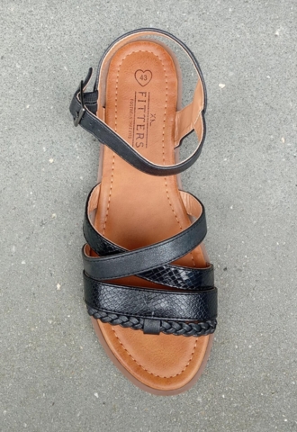 Super fin sandal med 5 for-remme der alle ser forskellige ud i materialet. Der er lak, præget kunstlæder, flettet kunst og glat kunst med let shine. Sandalen lukkes med spænde, og indlægssål og gummisål er cognacfarvet. Medium vidde.