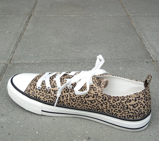 Frisk og fræk canvas sommersko, i brun leopard. Skoen har hvide snørebånd og hvid gummi-front. Rummelig pasform.