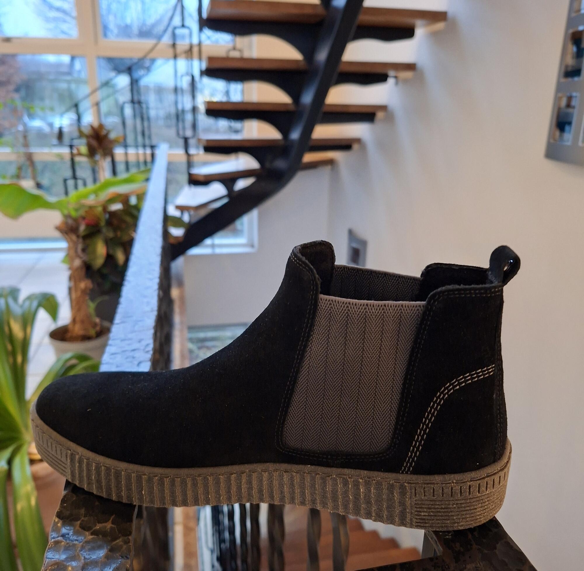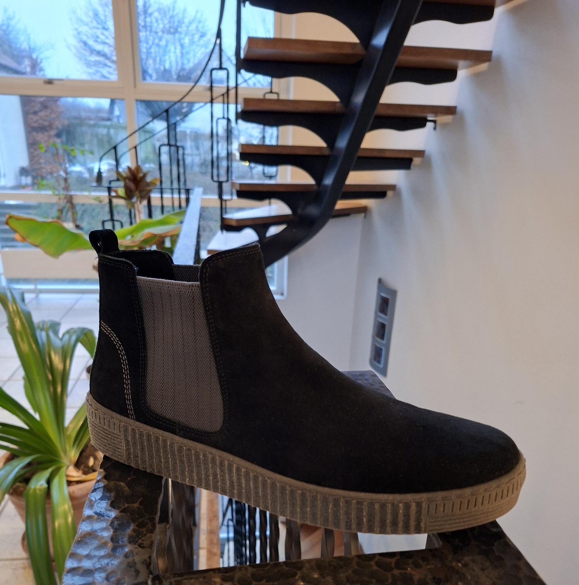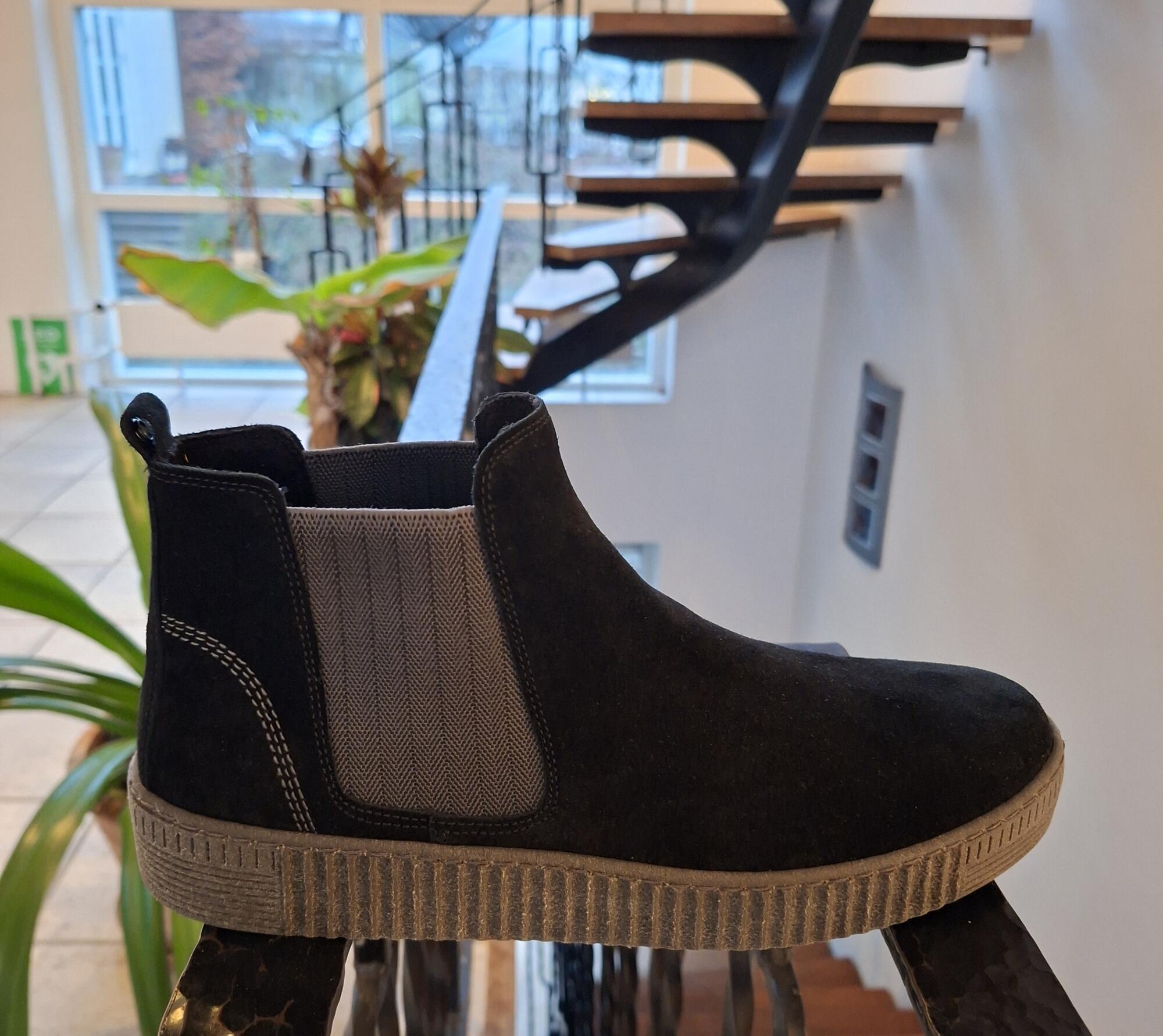 Sort støvlette i ruskind med mørkegrå elastik i begge sider. Støvlen er ideel som overgangsstøvle grundet den tynde foring. Der er løs sål og støvlen har medium vidde.