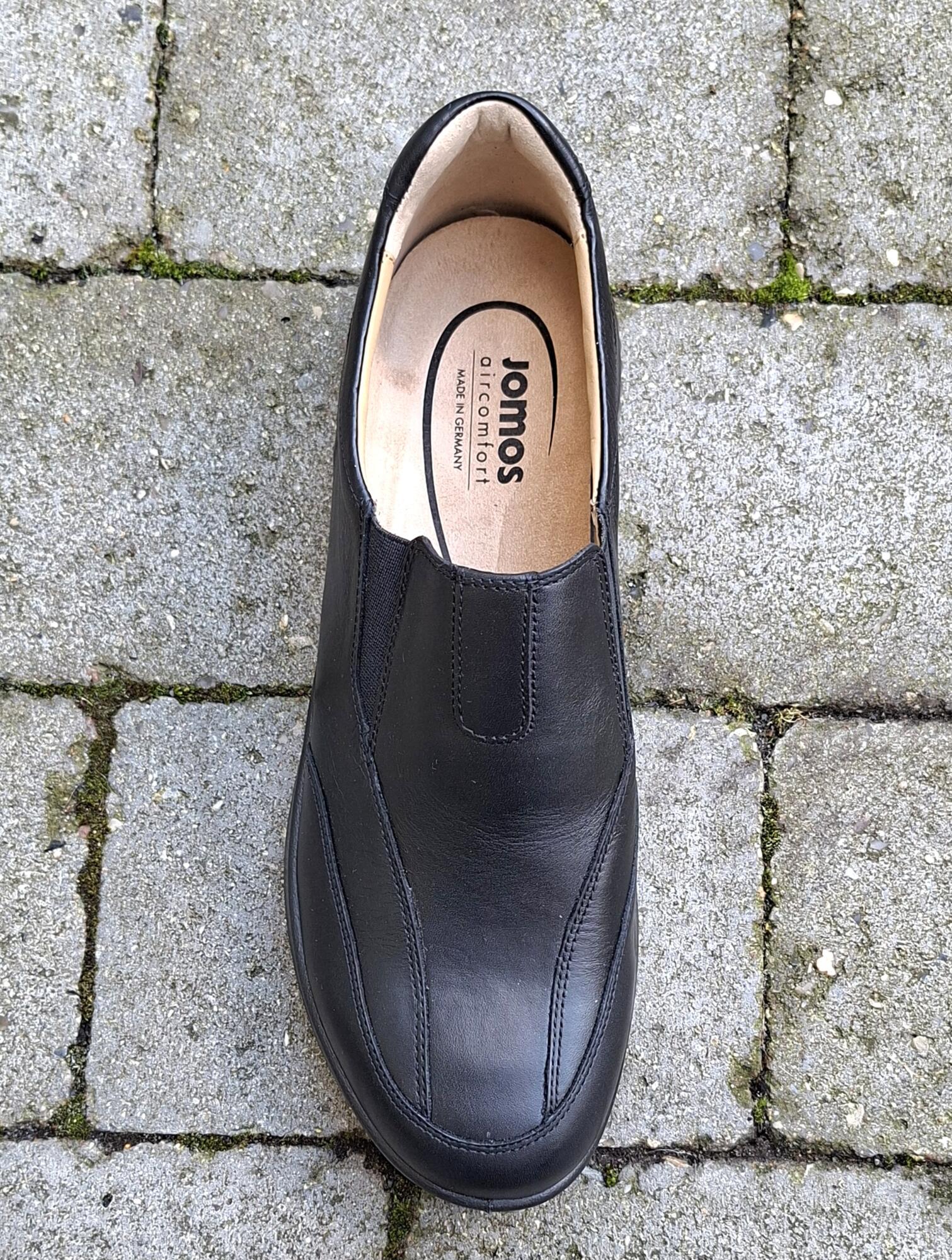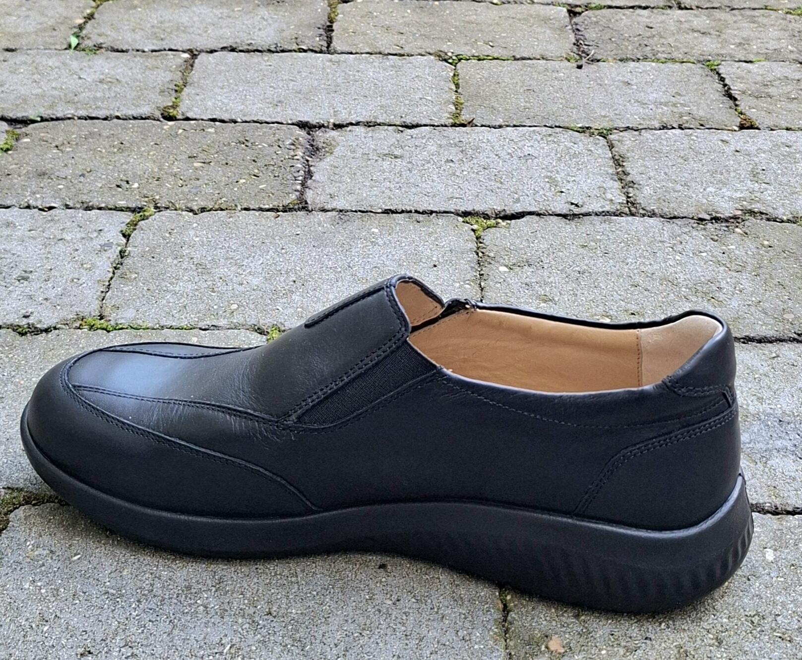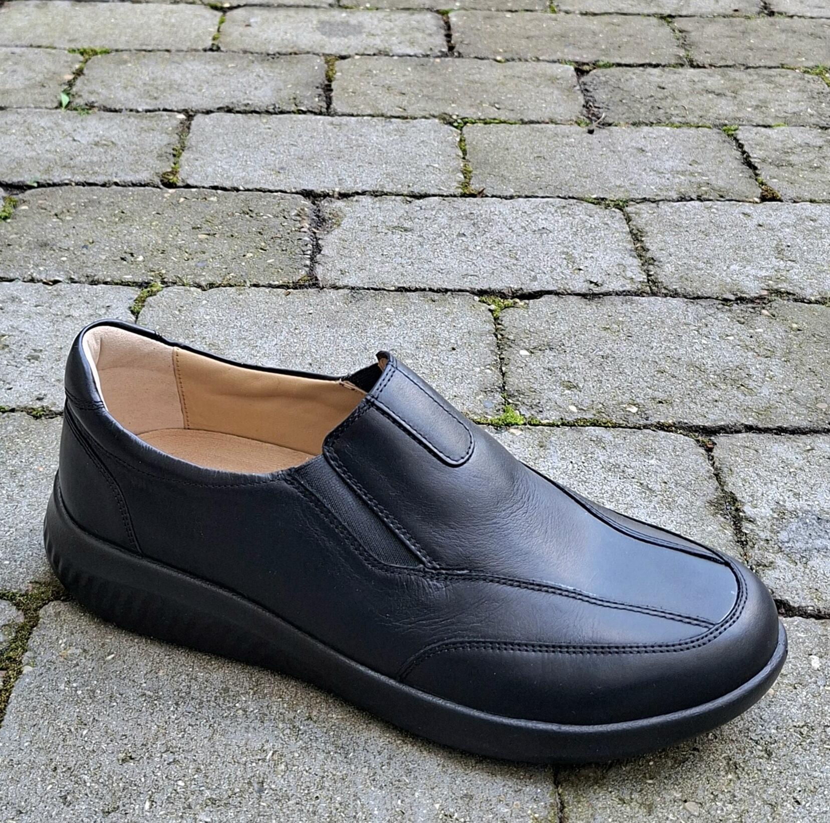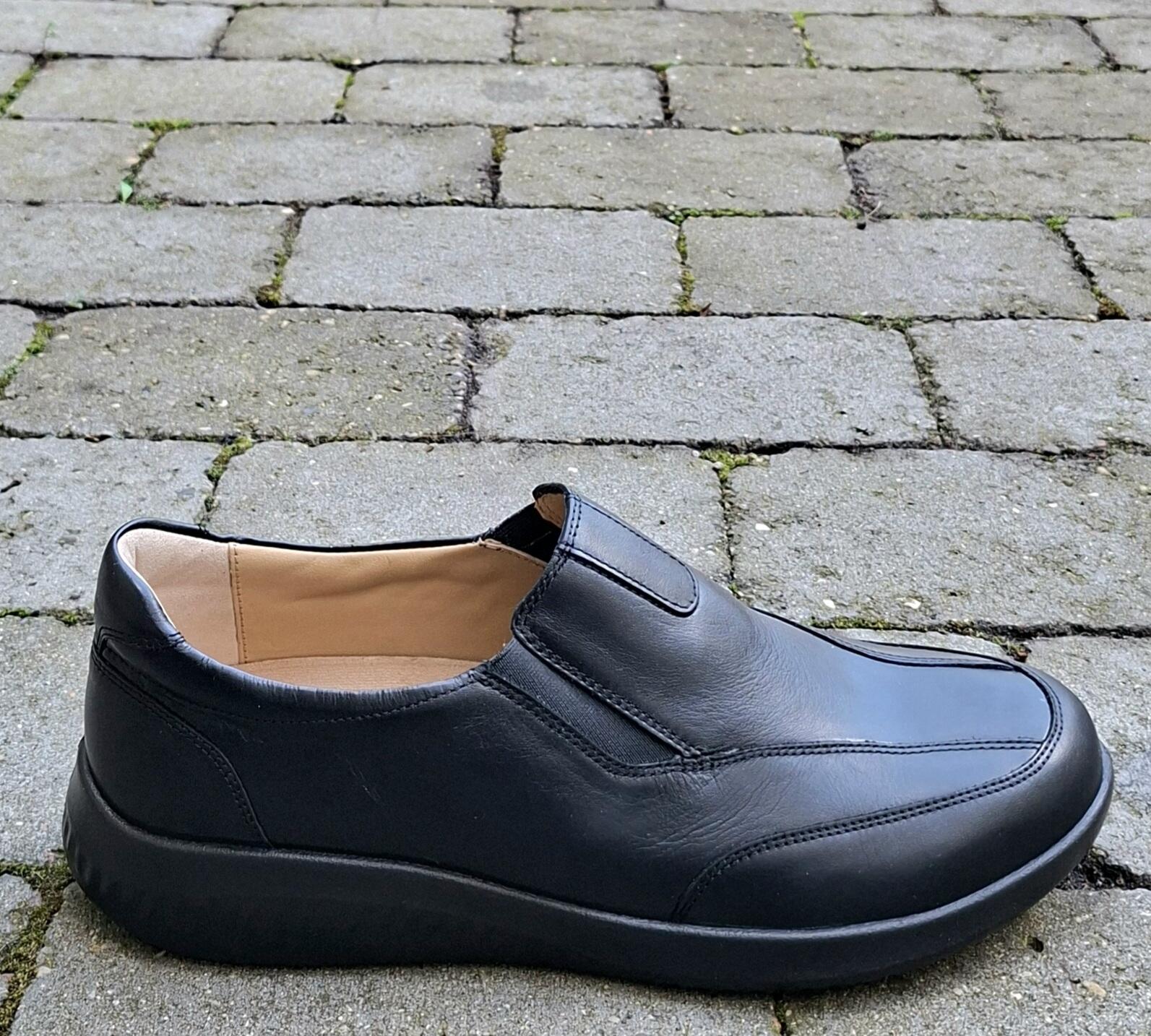 Sort bred stik i sko med masser af komfort. Skoen har sort elastik i siderne, den er skindforet, og du kan kan sålen ud hvis du bruger indlæg. En god basis-sko til hverdag med meget bredde og højde. Vidde K