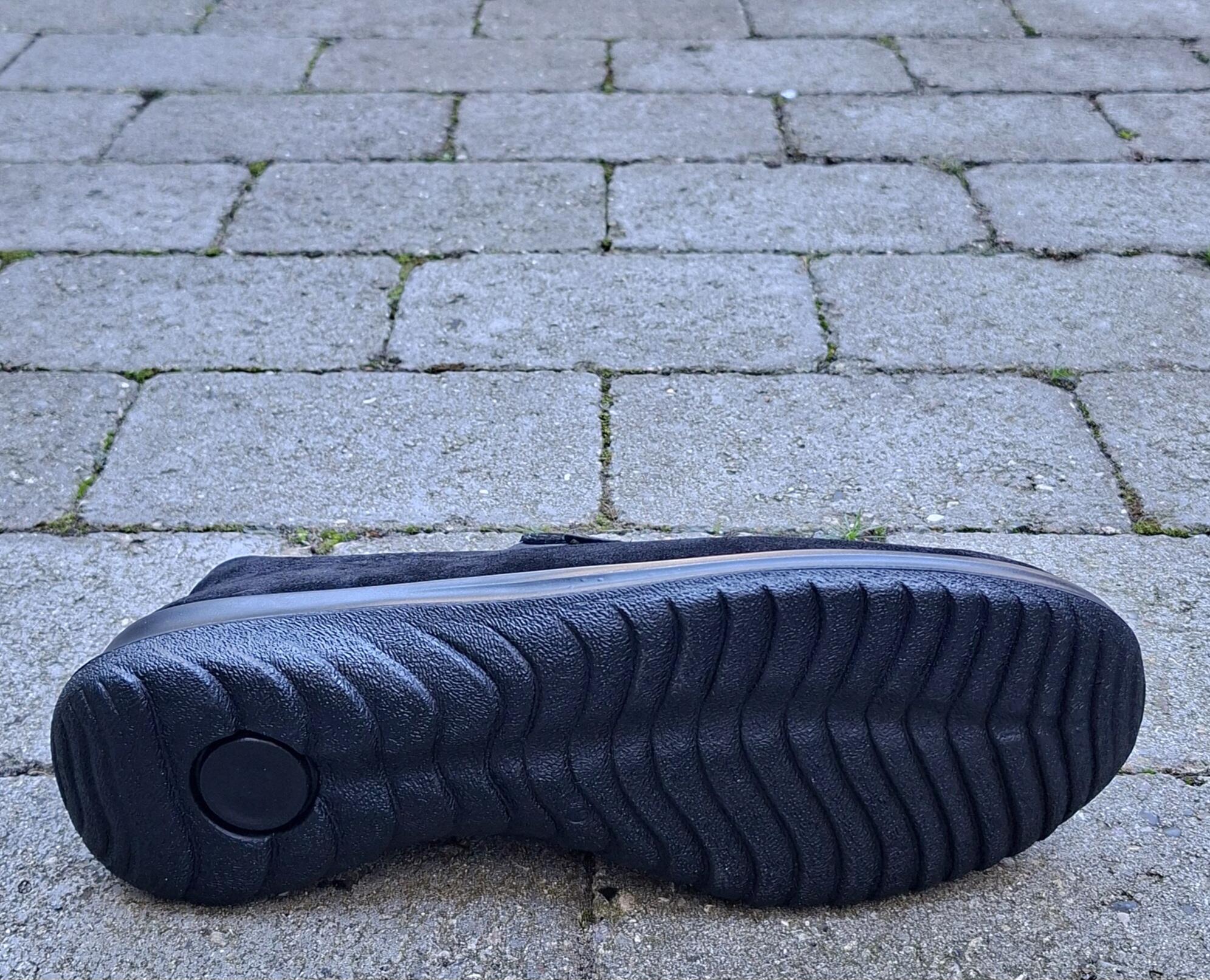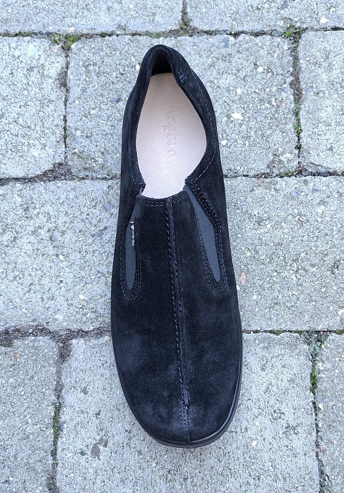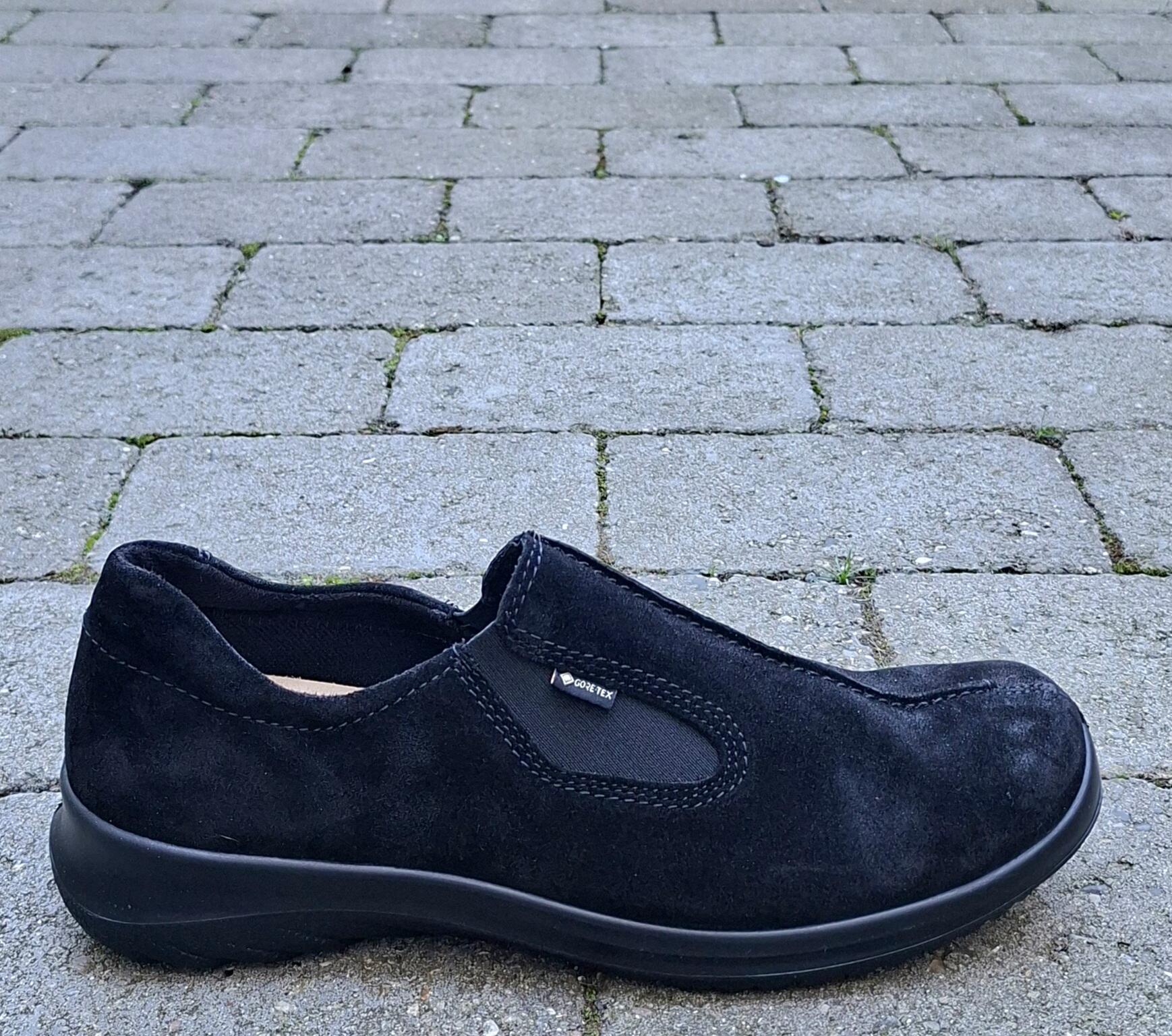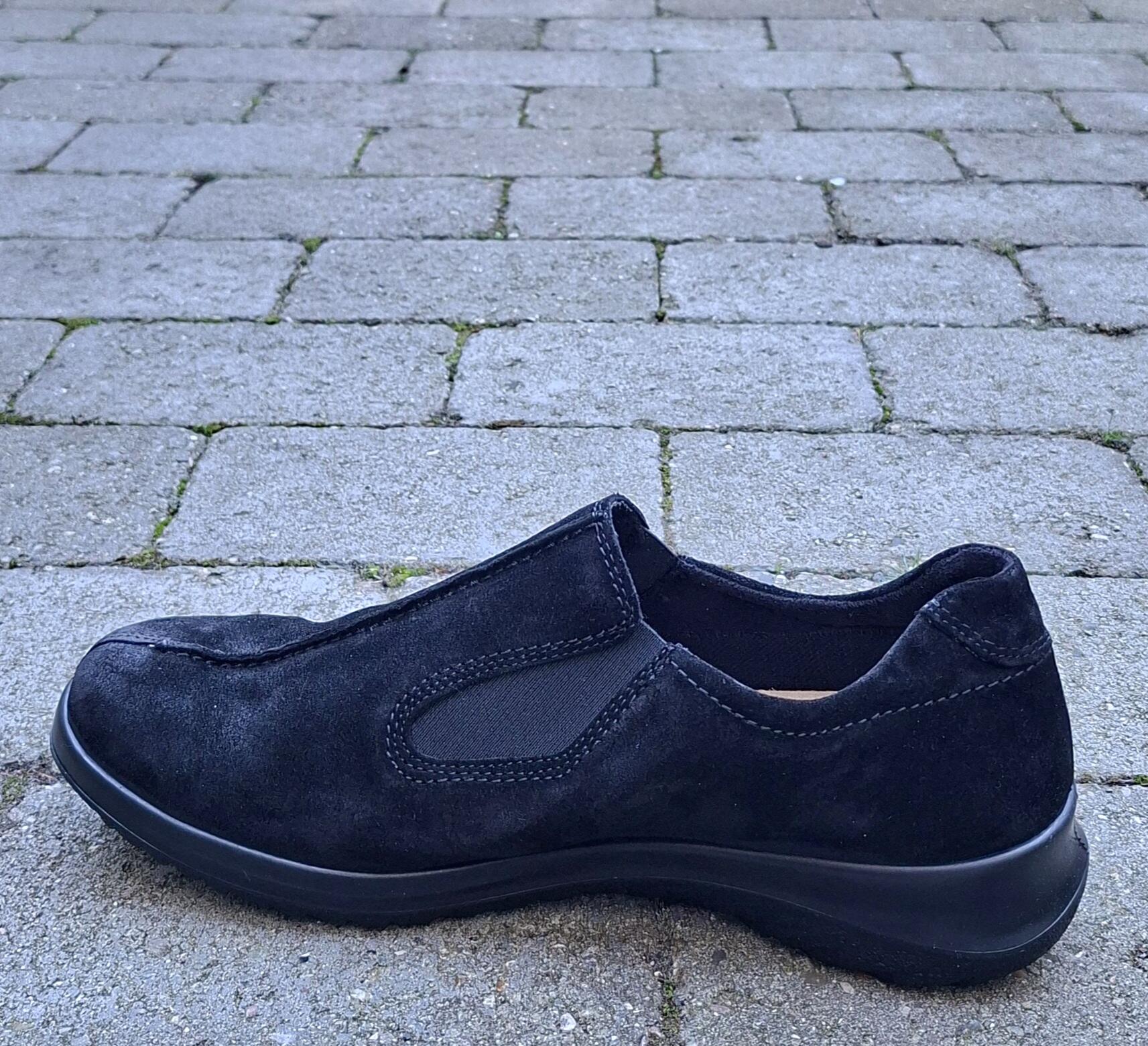 Til dig der ønsker en pæn neutral hverdagssko, som er nem at træde i, og føles behagelig fra første skridt. Skoen er i sort ruskind og den er vandafvisende. Der sidder elastik i siderne og den indvendige sål kan tages ud. Rummelig vidde.