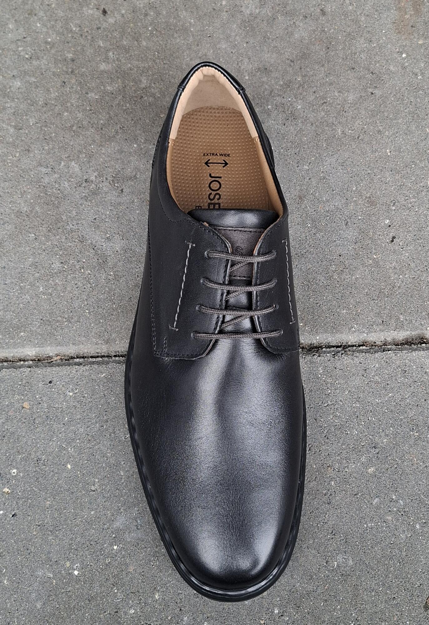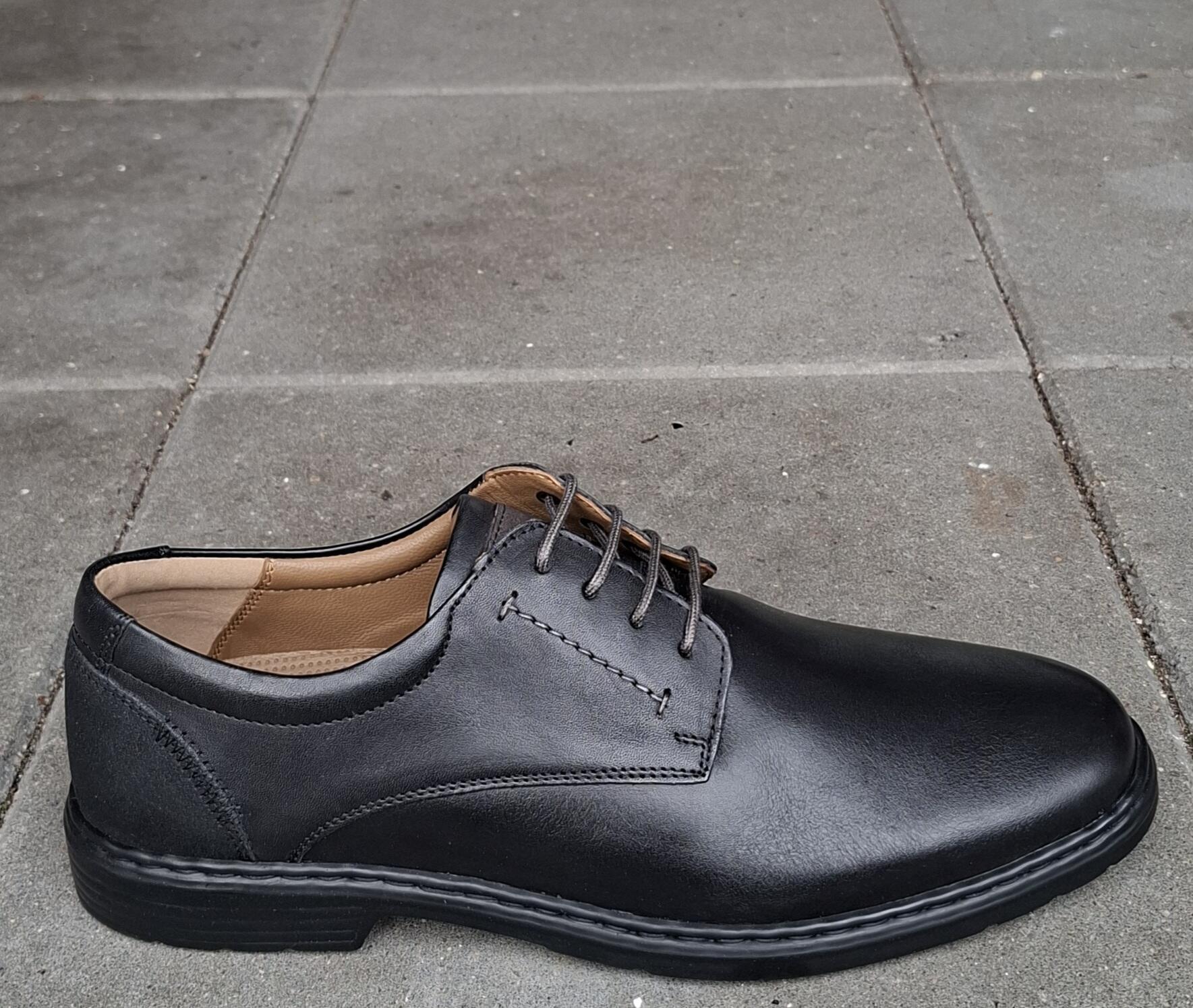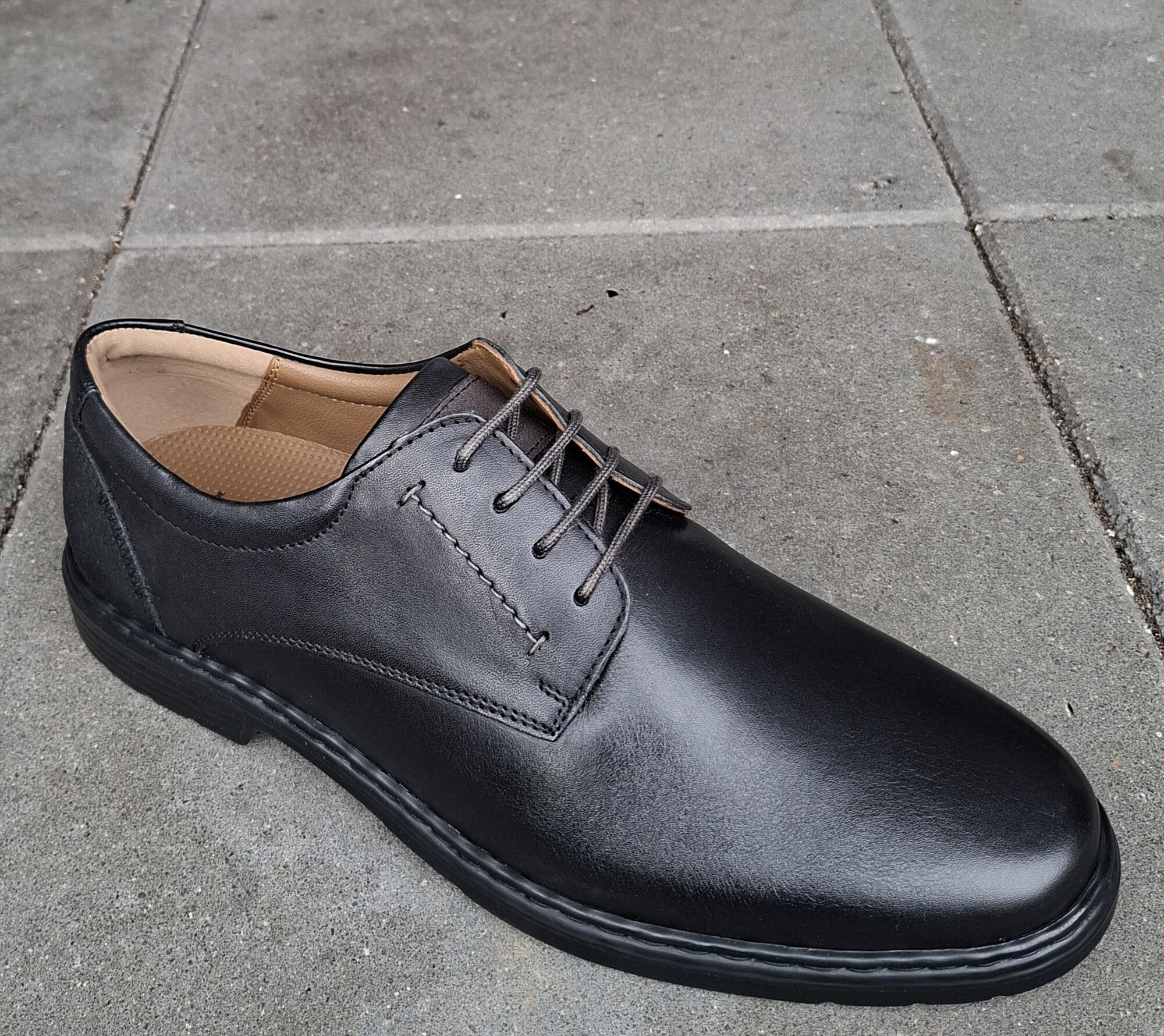 Sort snøresko med ekstra vidde i forfoden. K læst. Skoen er i sort skind med sort nubuck på bagkappen. Skoen er skindforet og har løs indlægssål.