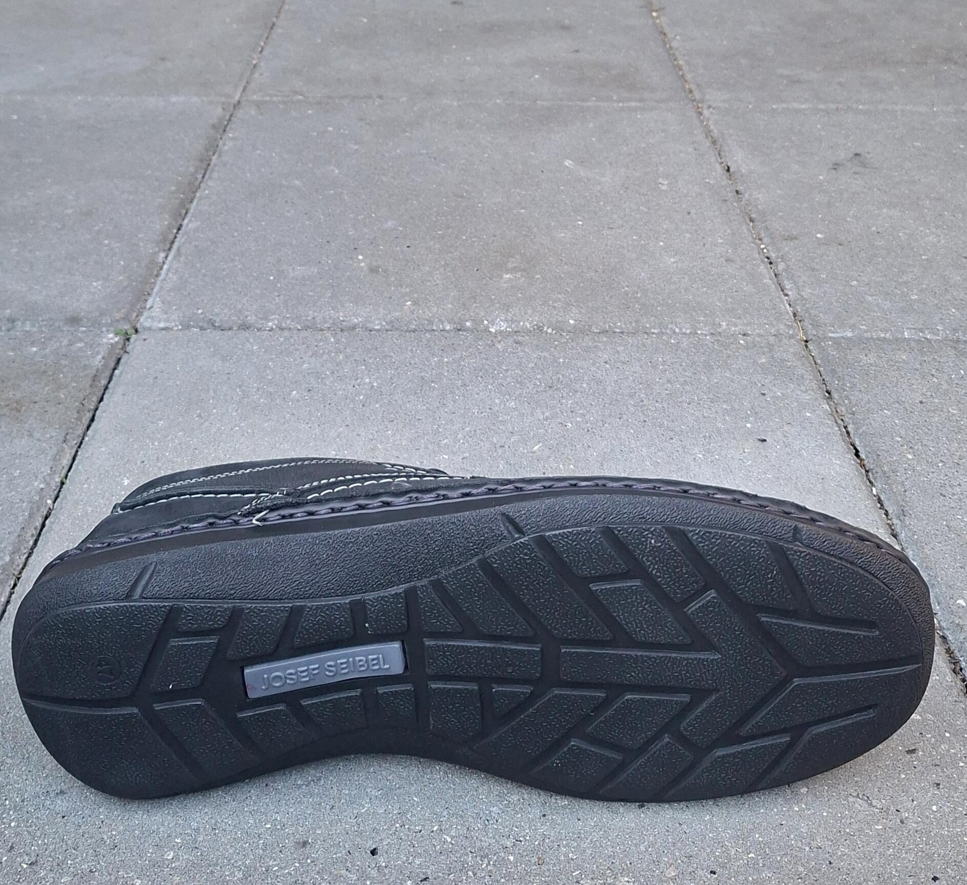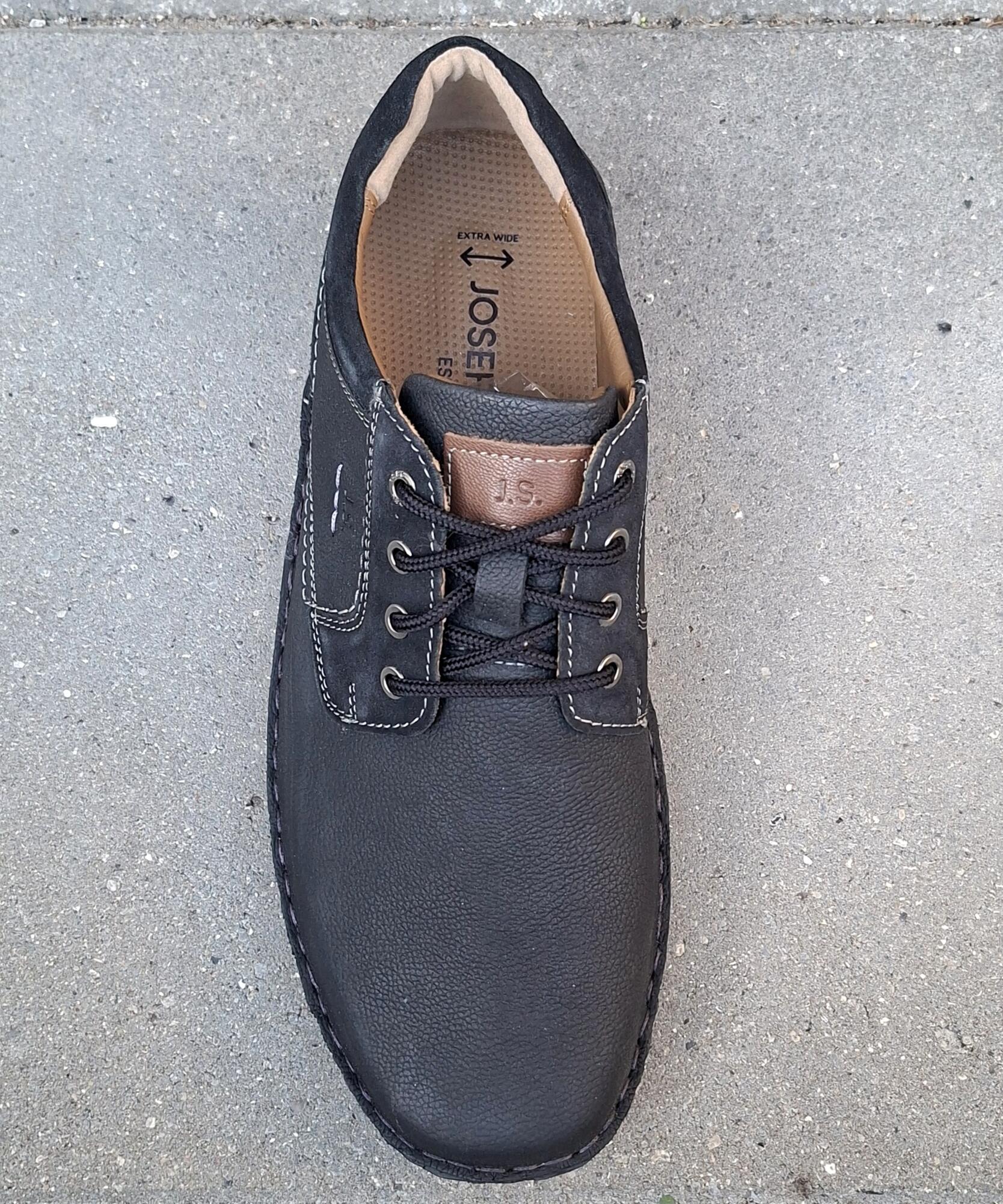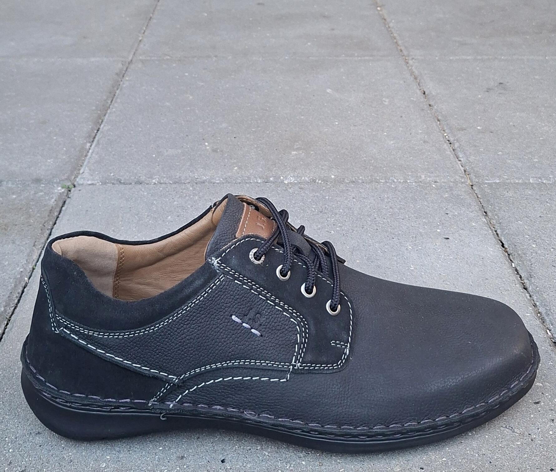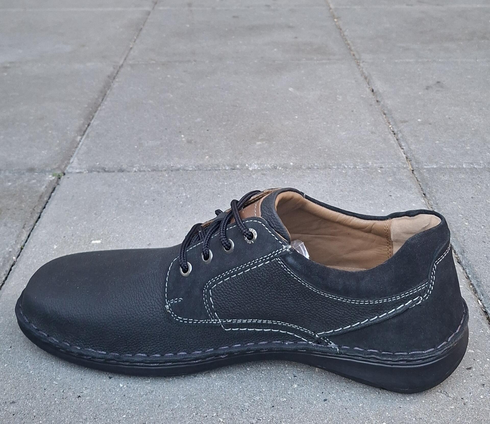 Super pæn snøresko i kombineret mat læder og nubuck. Skoen er sort med brune detaljer, og der er lyse syninger. Der er ekstra polstring i den udtagelige sål, og så har skoen ekstra bredde / Vidde K.