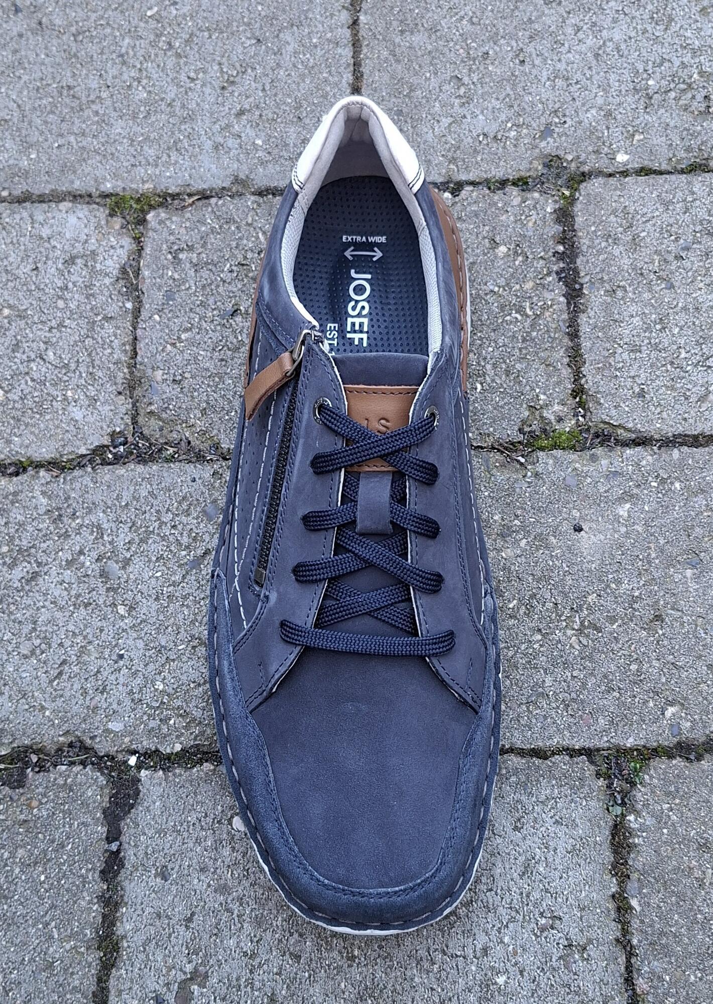 Smart og komfortabel herresko i en flot mørkeblå farve med brune detaljer ved hælen, som giver et moderne og stilrent udtryk. Skoen er udført i blødt nubuck med fine syningsdetaljer og perforeringer, der giver et let og afslappet look. Den har både snørebånd og en praktisk lynlås på siden, som gør den nem at tage af og på – lynlåsen er fuldt brugbar i hverdagen. Indvendigt er der en løs indlægssål, som kan tages ud og eventuelt udskiftes efter behov. Modellen er ekstra bred i pasformen med vidde K, hvilket giver god plads og komfort til foden.