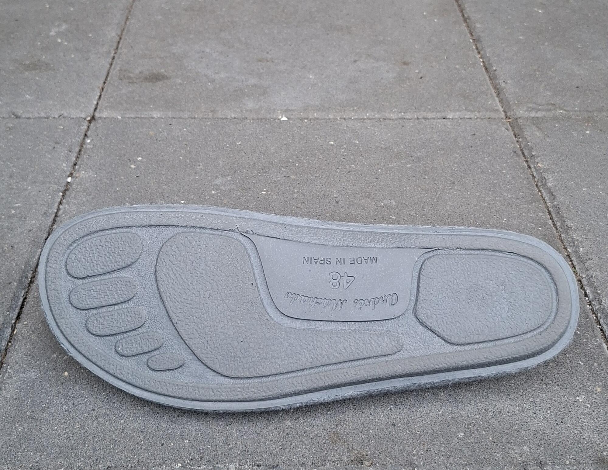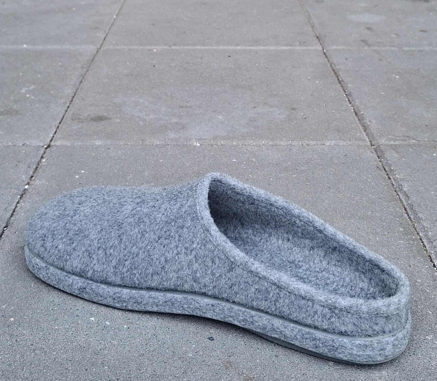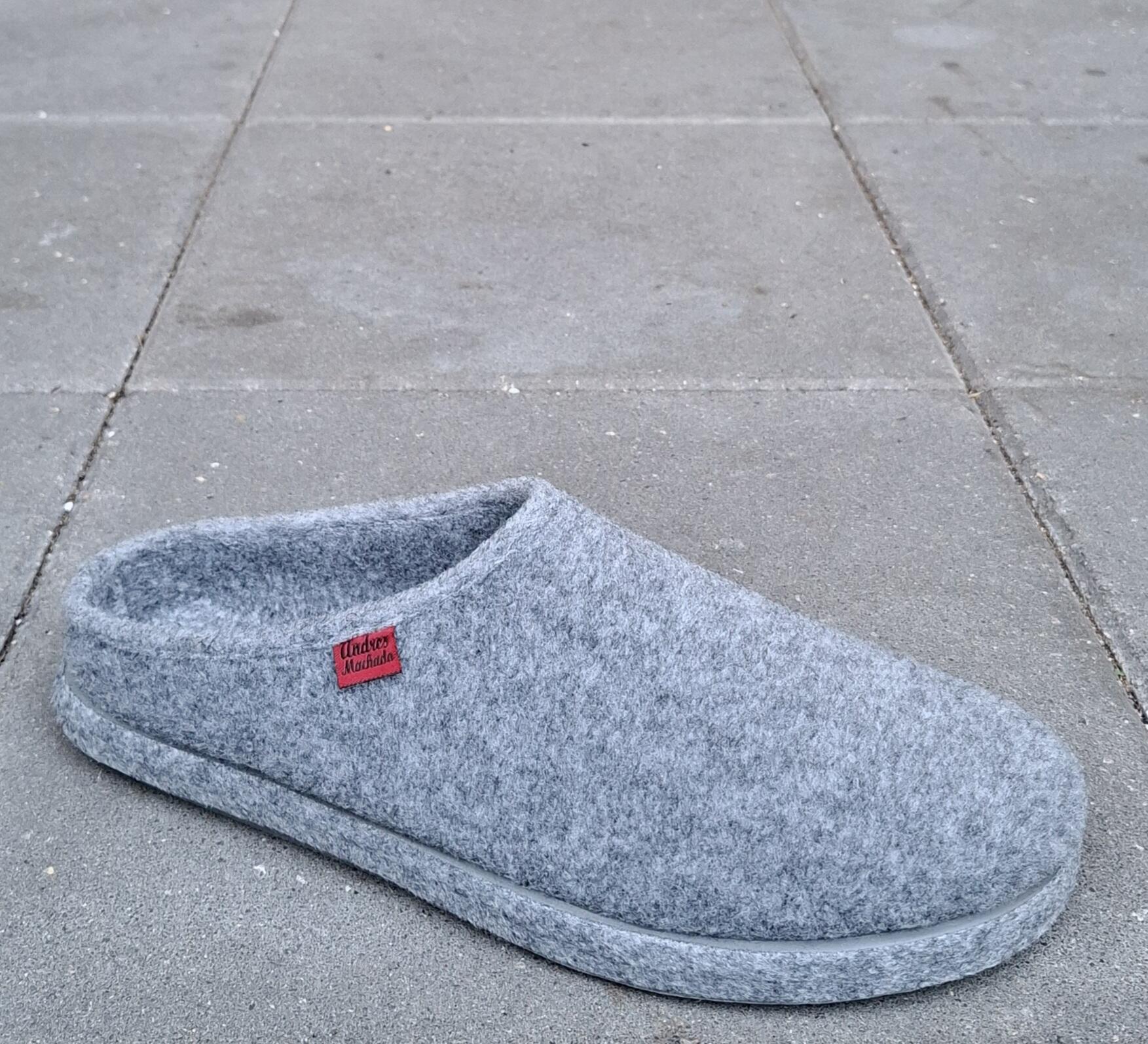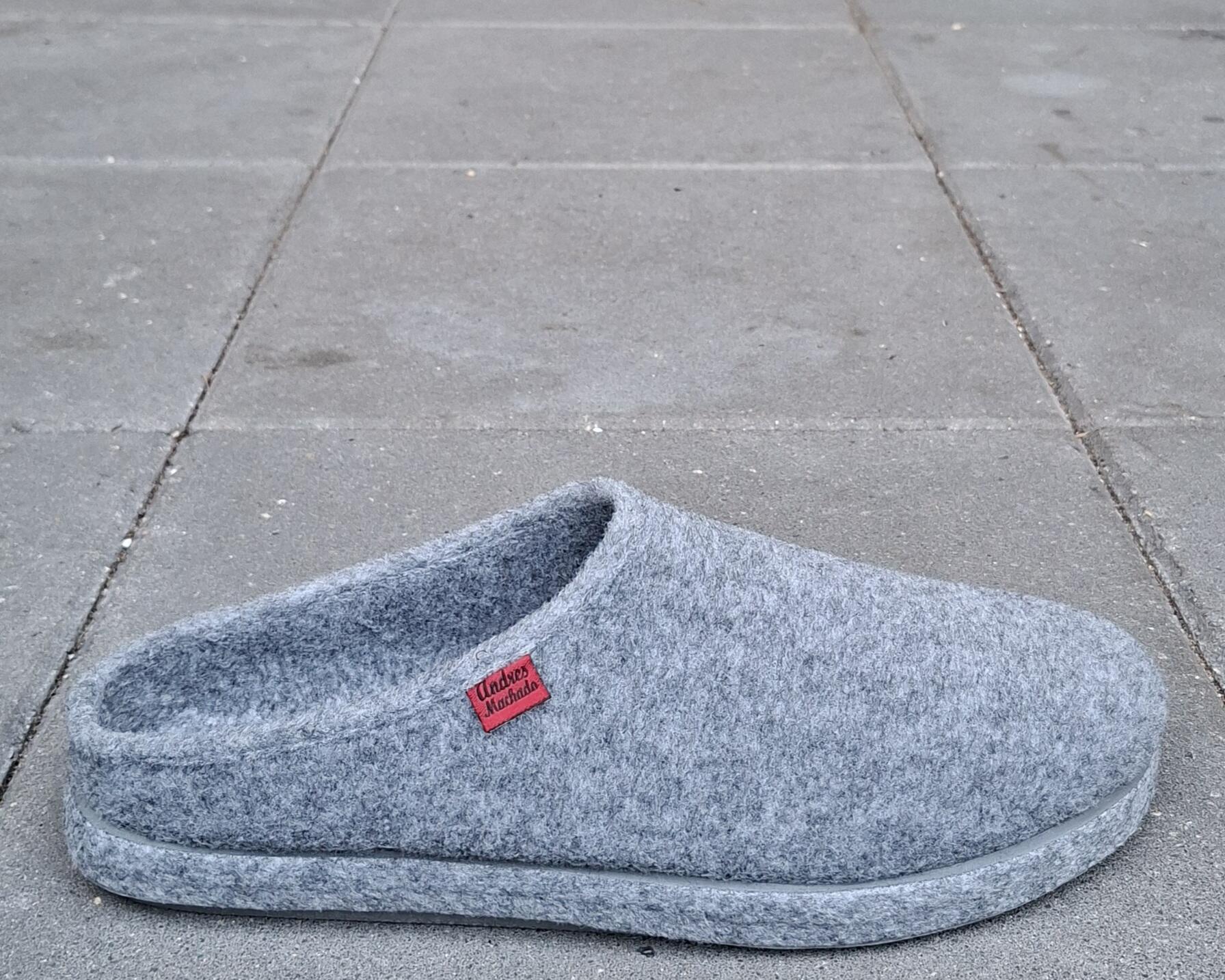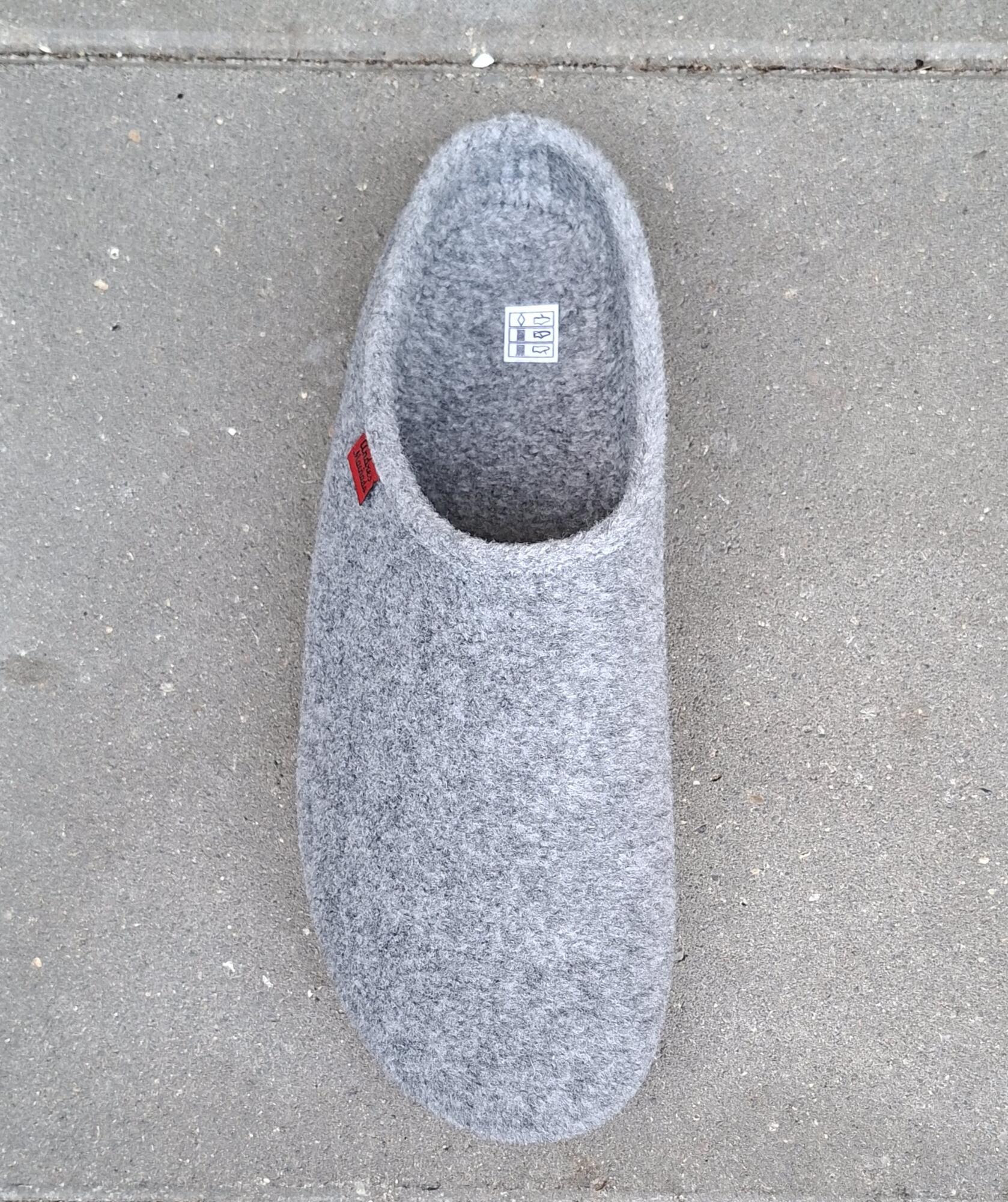 Blød lun hjemmesko med halv bagkappe i lysegrå farve. Hjemmeskoen har et rødt logo på ydersiden og smidig udvendig gummisål. Let bred vidde på forfoden.