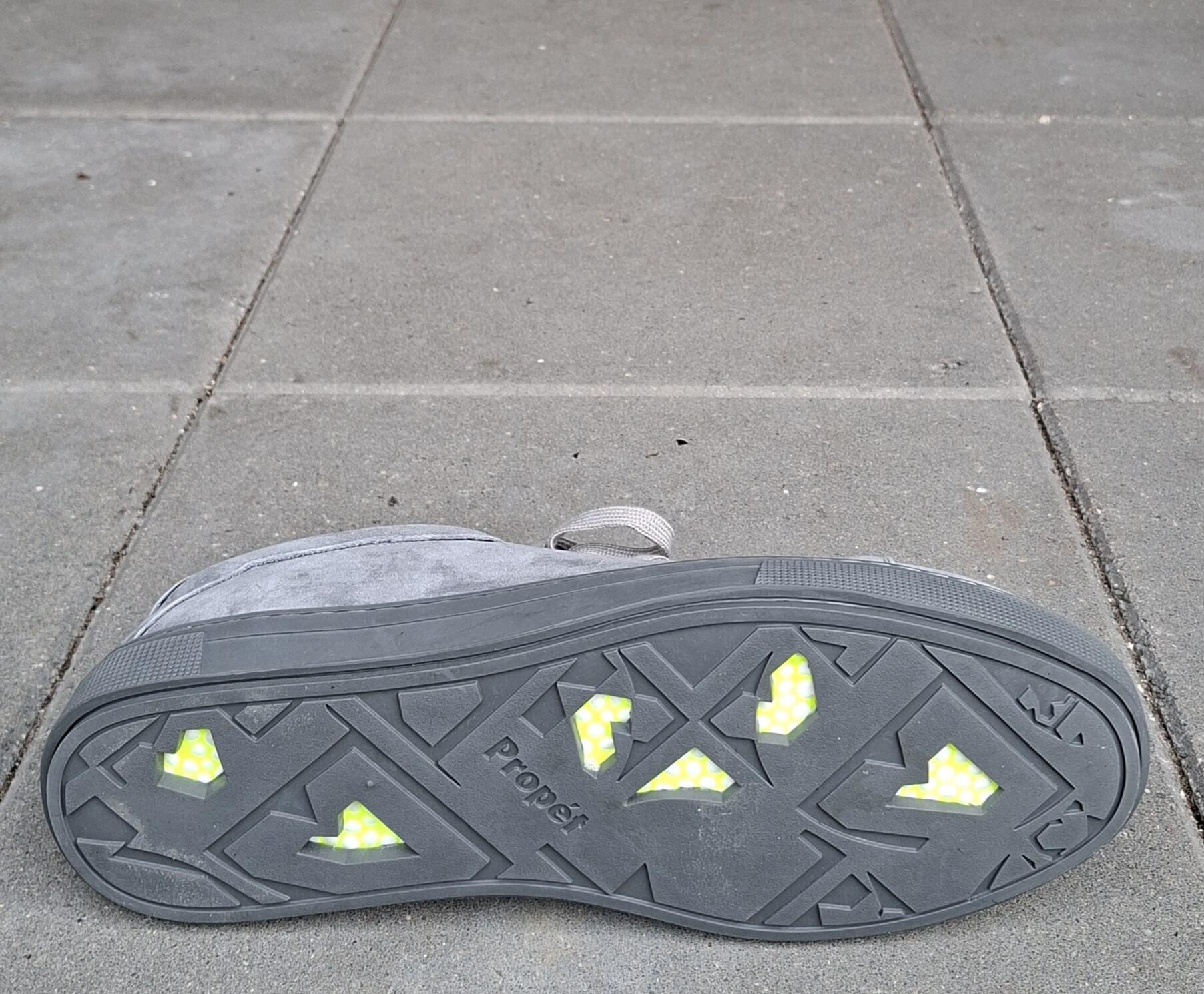 Grå sneakers i ruskind med grå snørebånd og grå ydersål. Skoen er skindforet og utrolig behagelig at have på. Modellen har en dejlig god bredde på vidde 5E. Anbefales derfor ikke til smal fod.