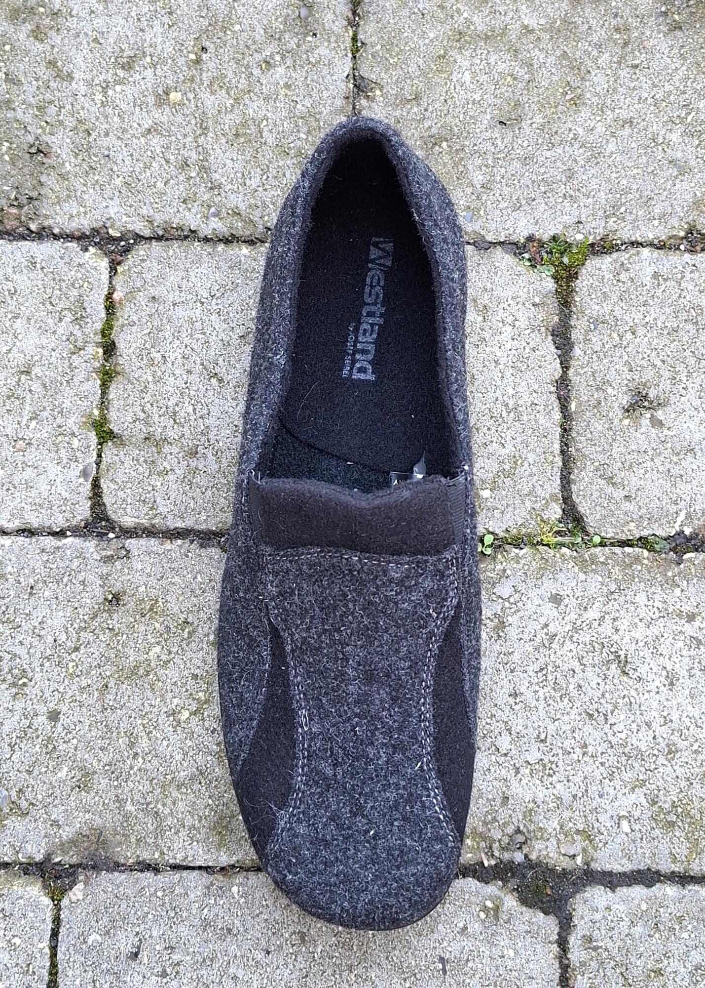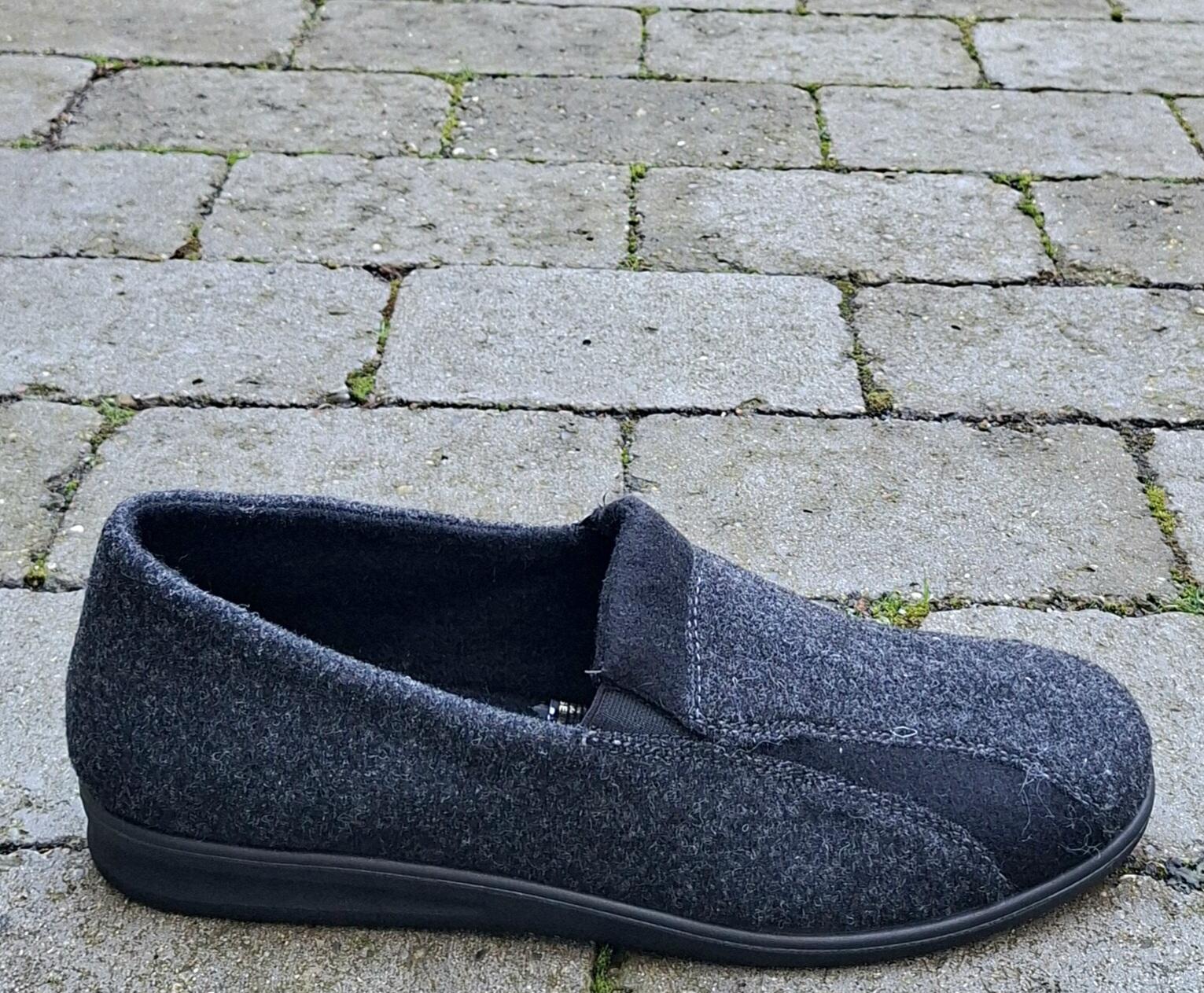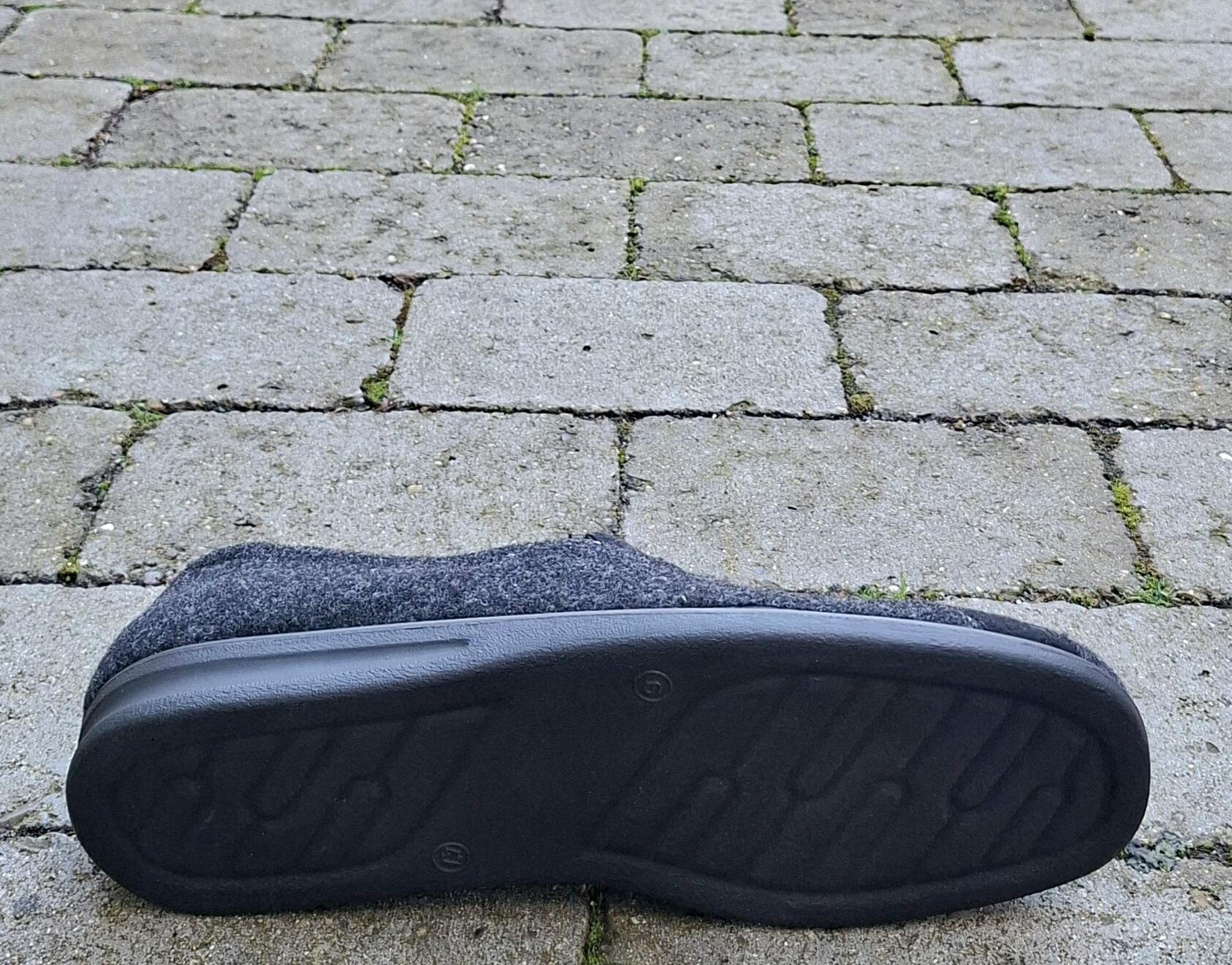 Varm og blød hjemmesko i grå og sort farve. Der er fuld bagkappe og den rillede ydersål gør skoen mere modstandsdygtig på glatte gulve. Medium vidde.