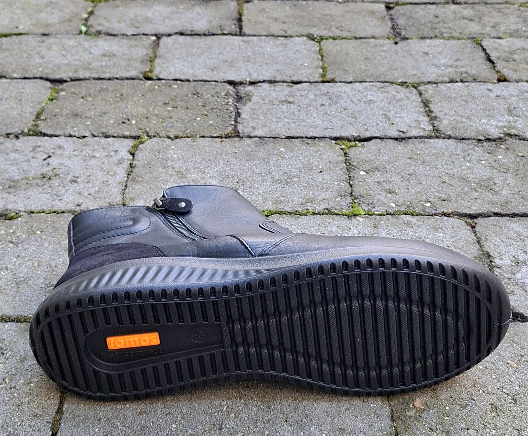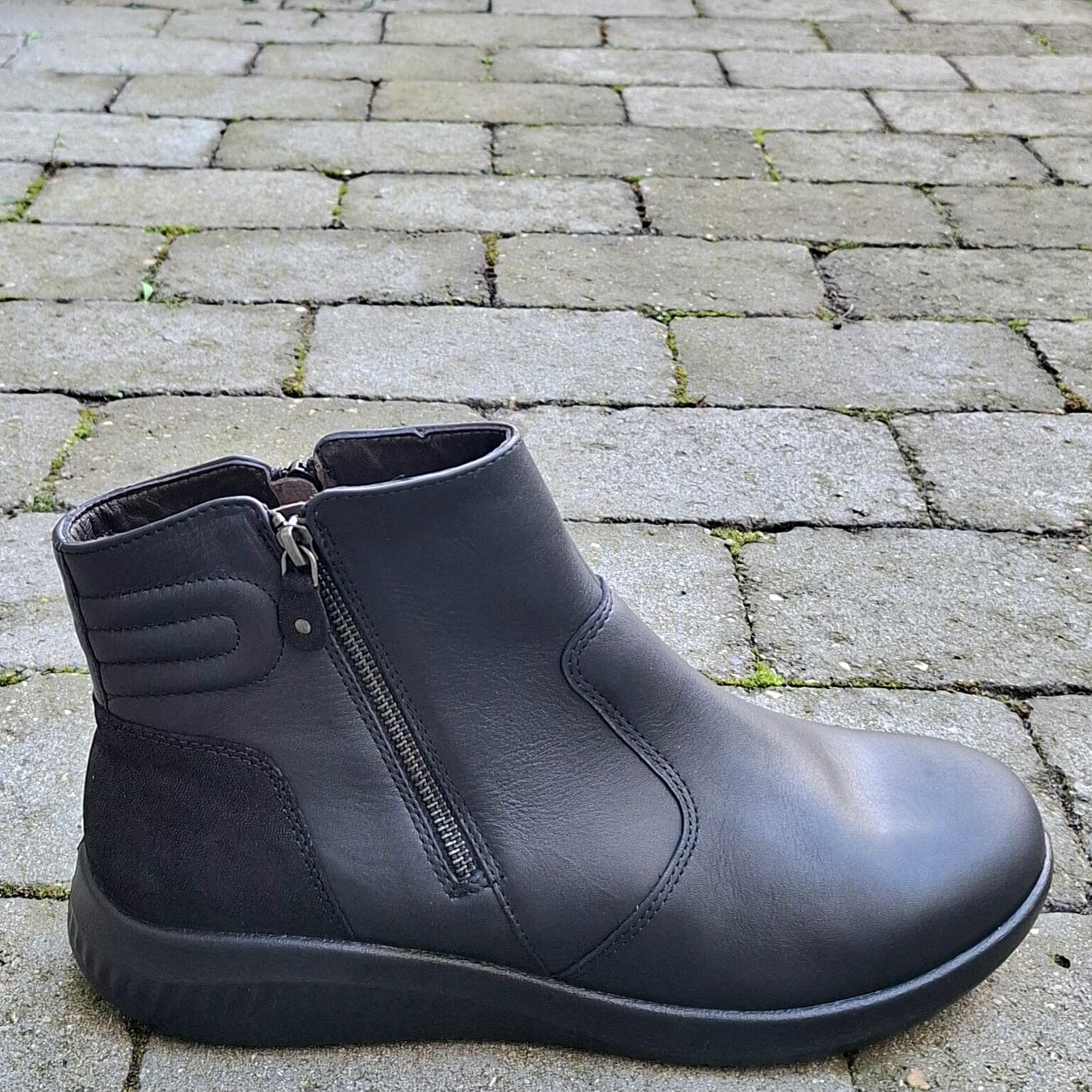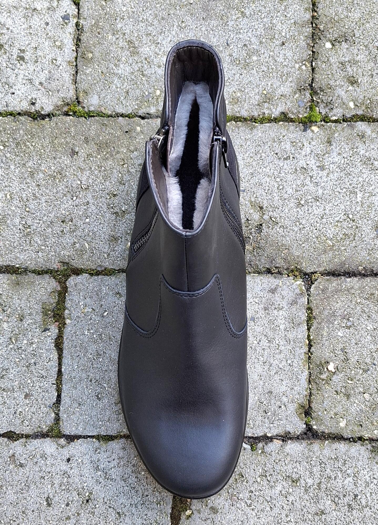 Bred sort ankelstøvle i kombineret glat læder og nubuck. Støvlen lukkes med 2 lynlåse, og inde i støvlen er der varm uld foring. En yderst blød og behagelig støvle til dig der søger ekstra vidde i støvlerne.