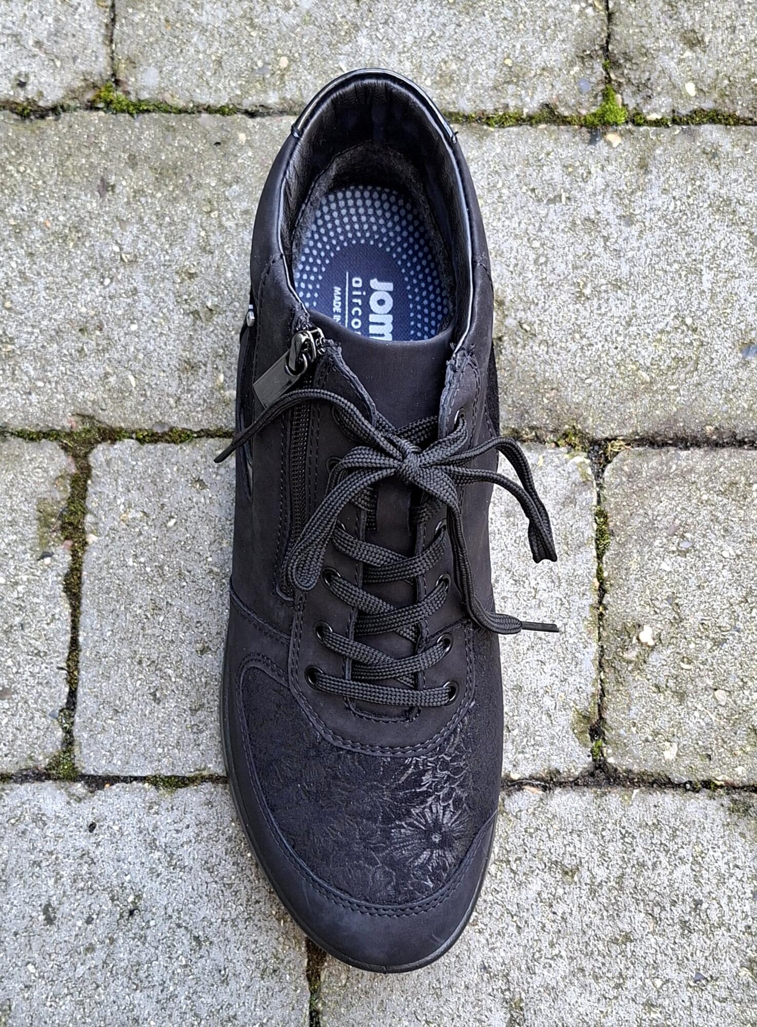 Smart kort snørestøvle i sort nubuck, med præget blomsterprint foran, og lak beklædt skind øverst på bagkappen. Der er sorte snørebånd, udvendig lynlås og støvlen har varm foring. Super blød og komfortabel støvle. Bred model / Vidde K.