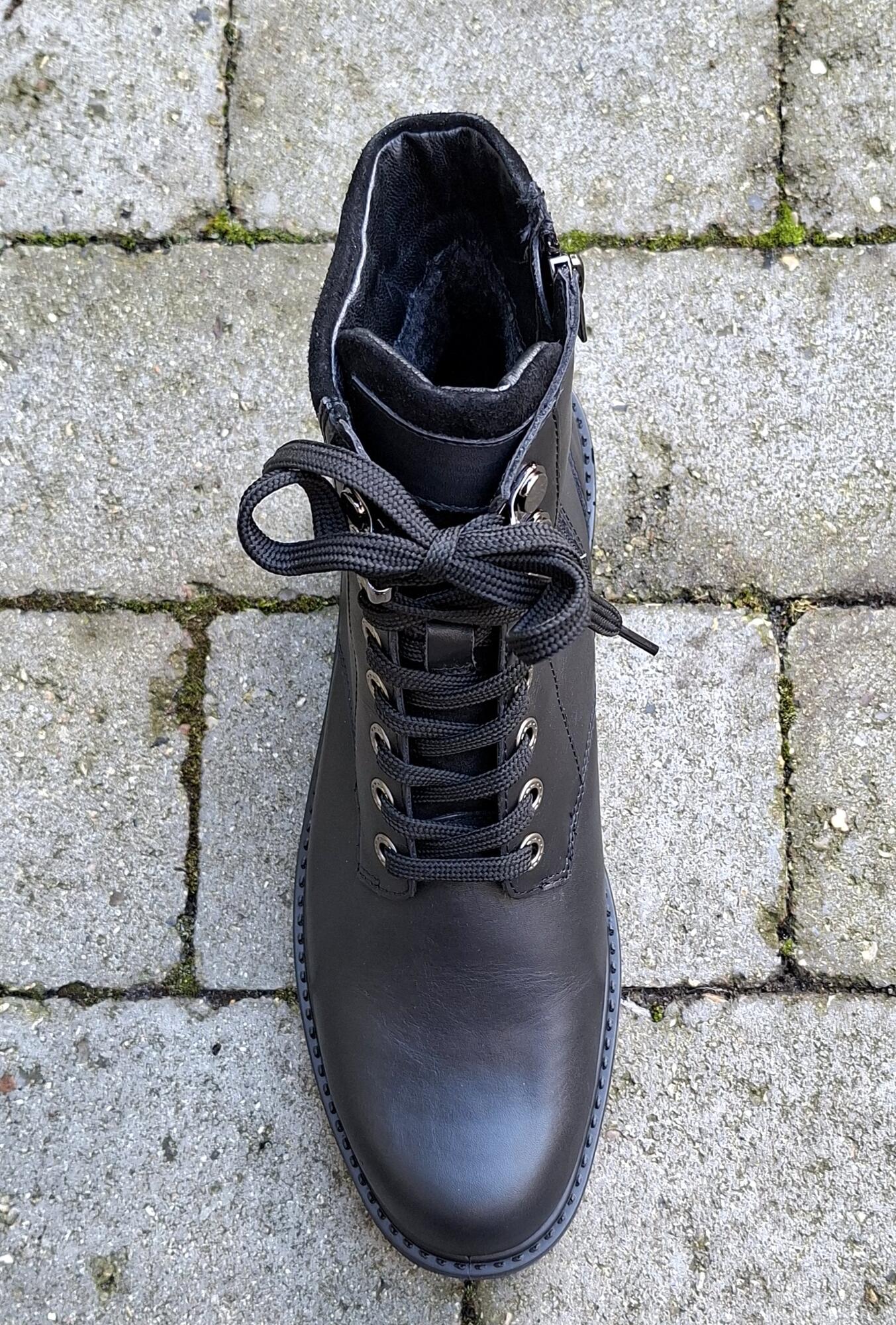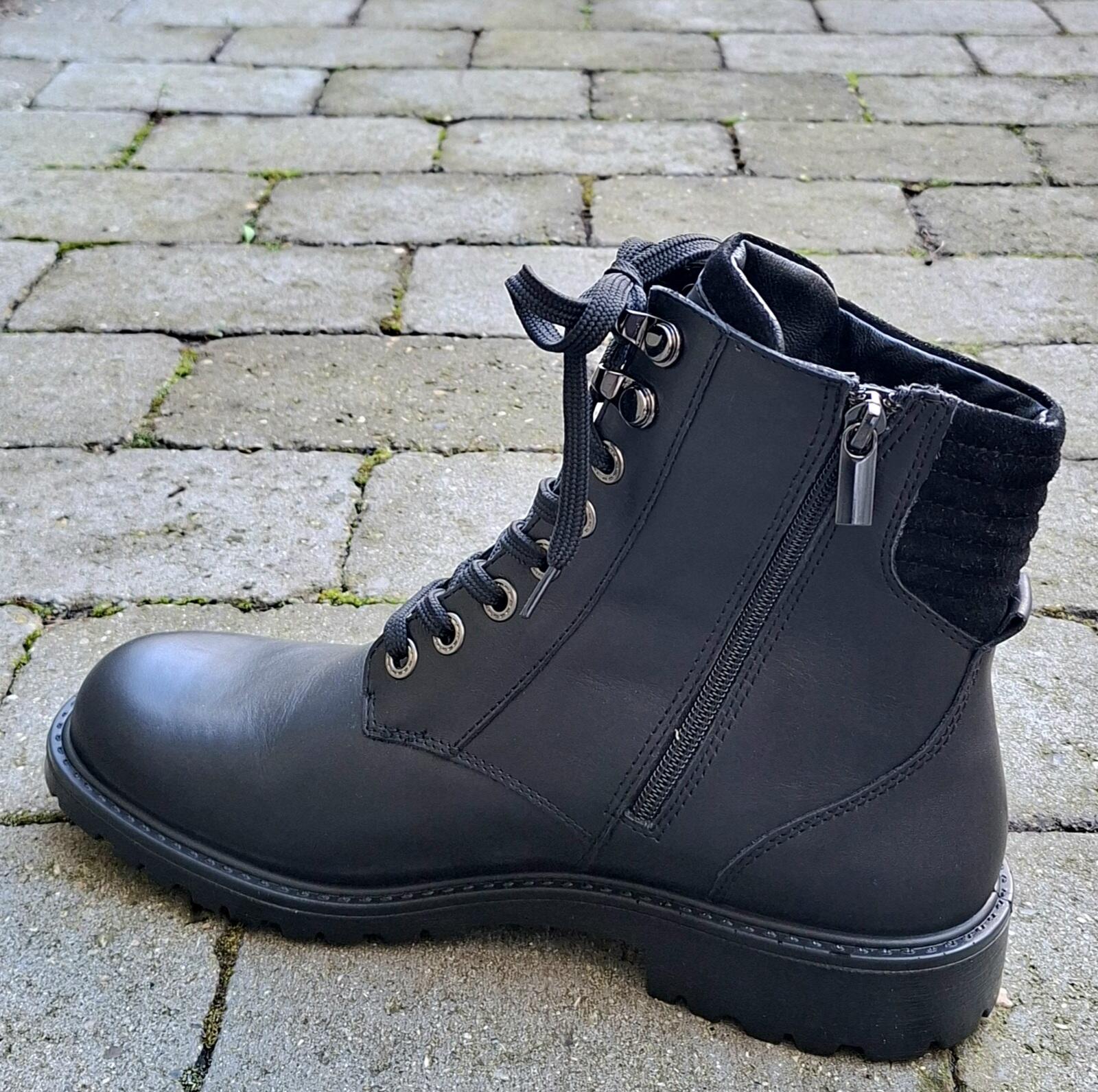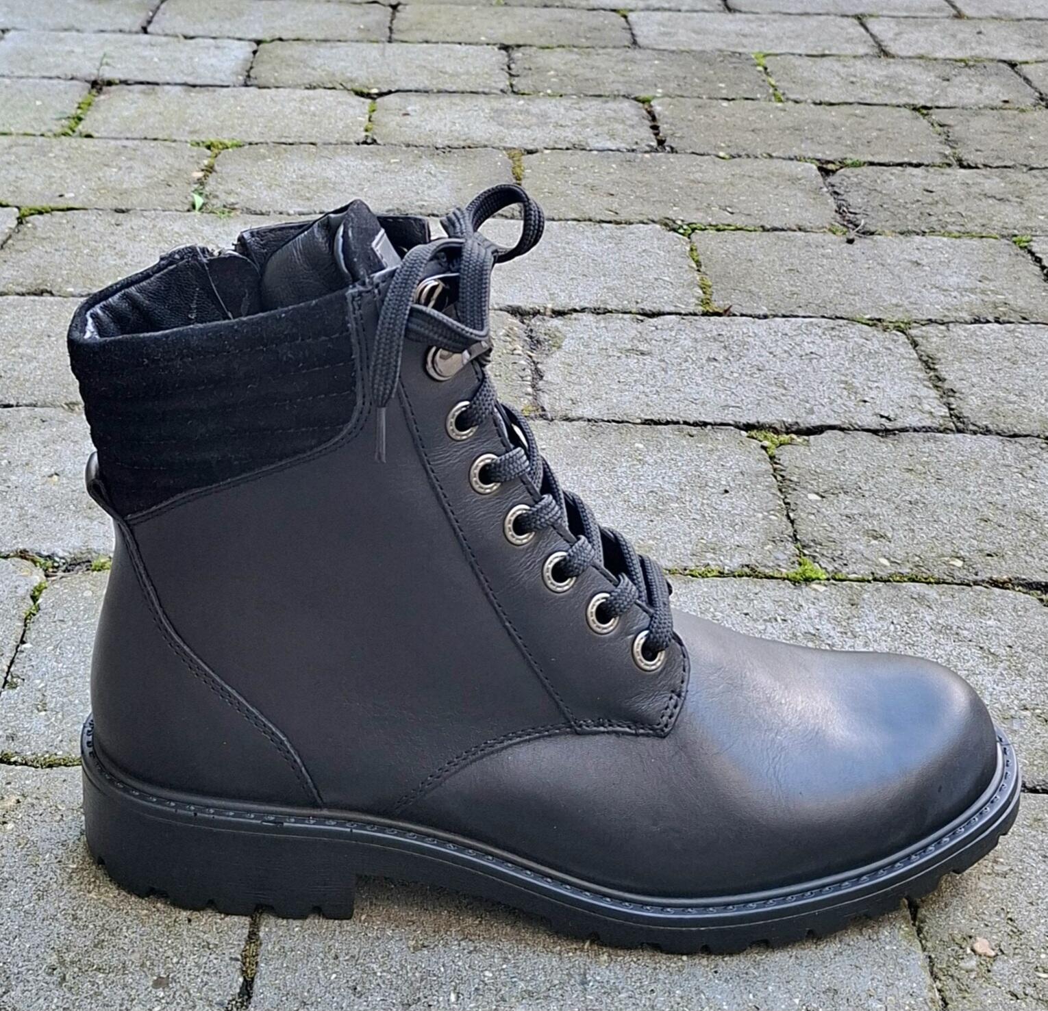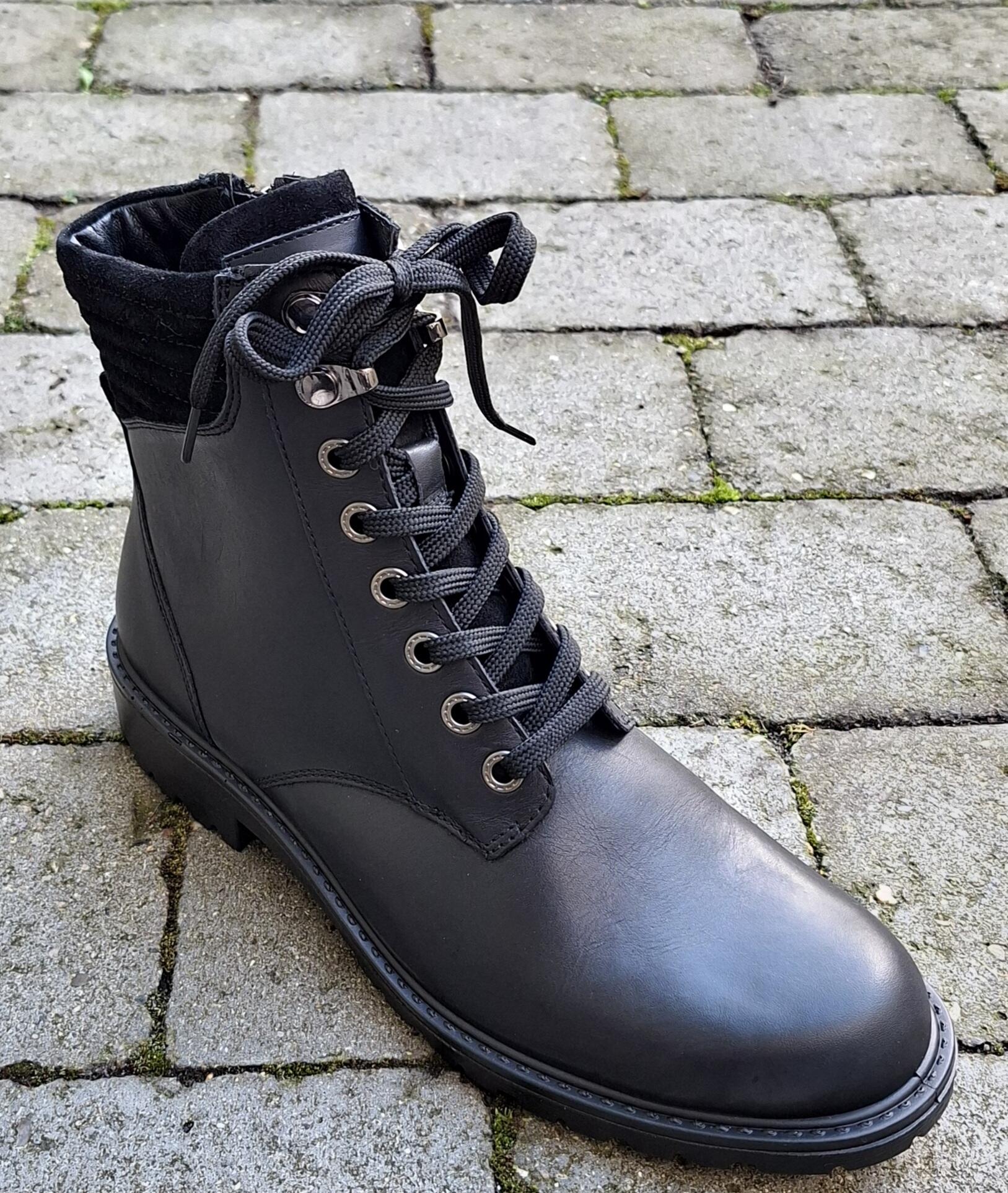 Sort snørestøvle i kombineret glat skind og ruskind. Støvlen har sorte snørebånd og lynlås på indersiden. Der er varm foring og løs indlægssål. Rummelig vidde H og masser af komfort.
