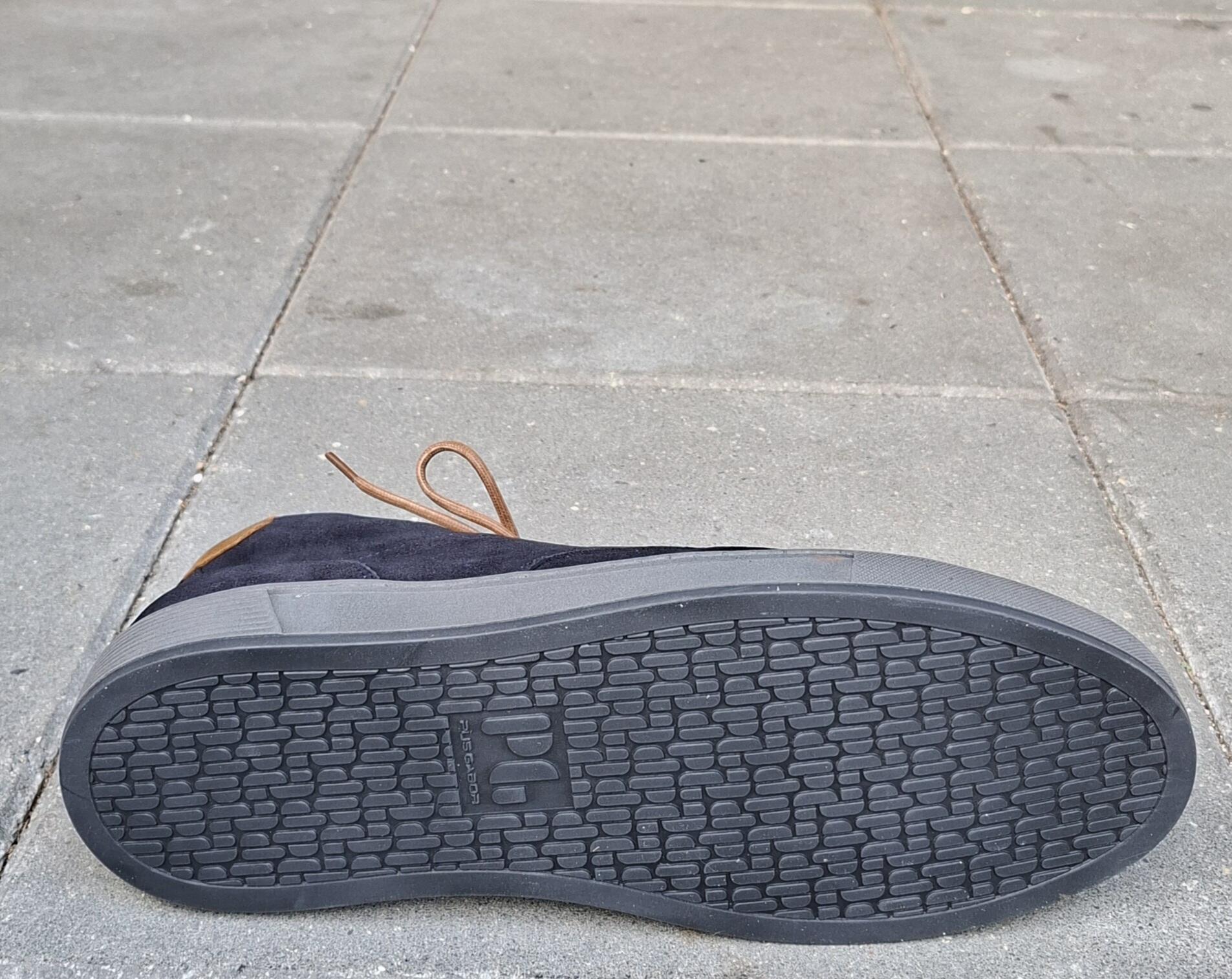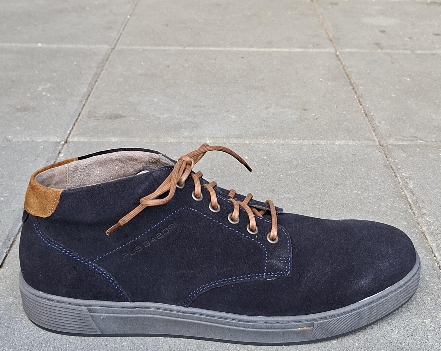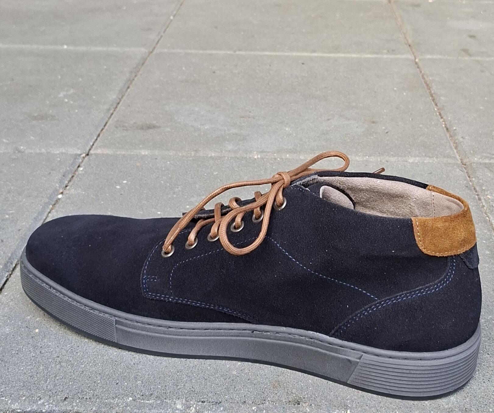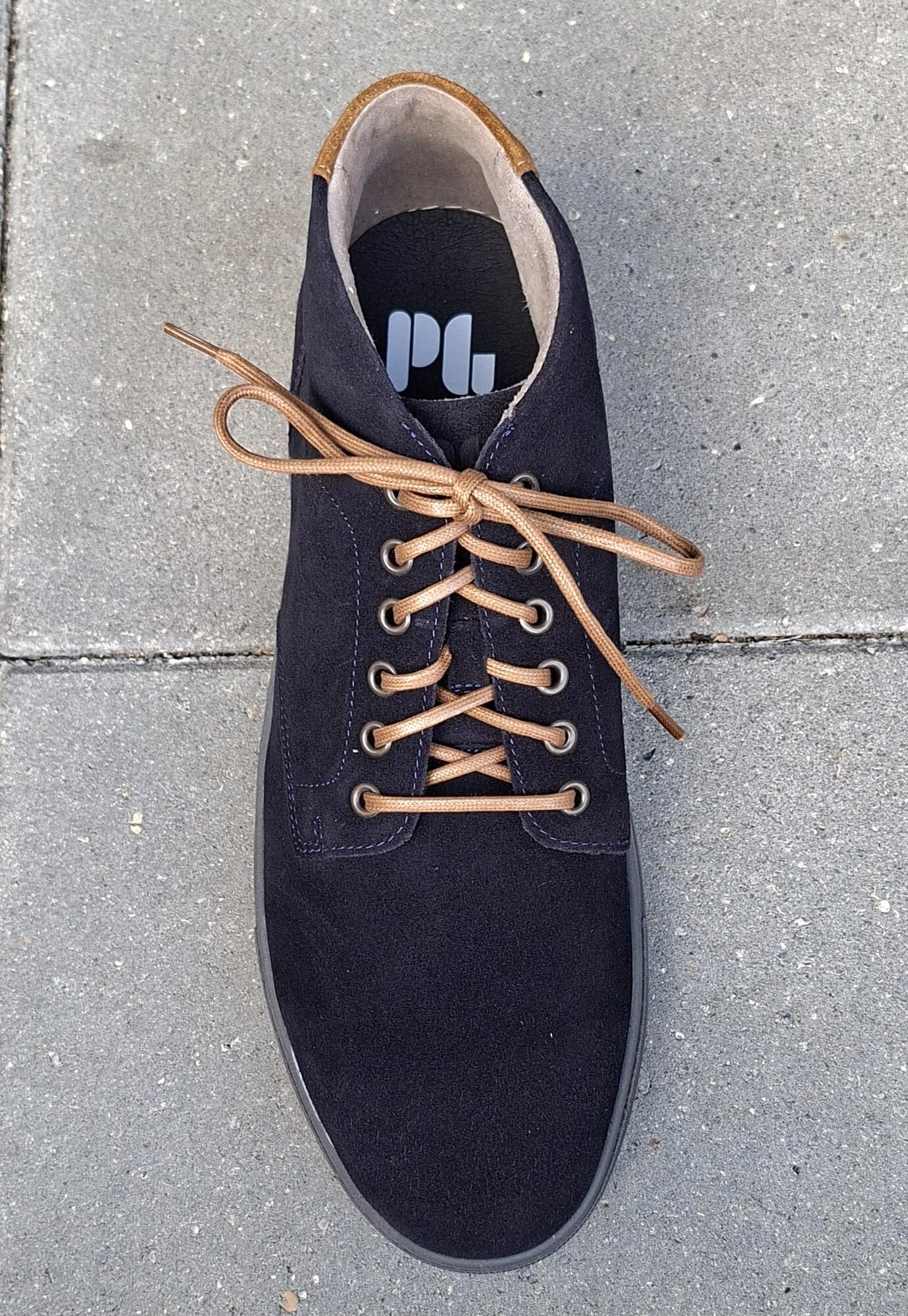 Smart lav snørestøvle i kombineret mørkeblå og lys brunt ruskind. Der er brune snørebånd og udtagelig sål. Almindelig bredde.
